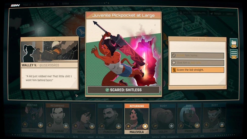 As for the actual “dispatching,” it’s one of the most addictive parts of the game. At the climax of each chapter, you manage dispatch missions by sending heroes to try and respond to crises in real time. Each one requires skill checks of either combat, vigor, mobility, charisma, or intellect; however, I must stress: it’s a probability matrix, so it’ll always be a roll of the die in outcome.