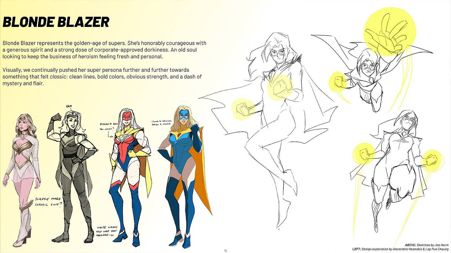 Erin Yvette, a Telltale regular from The Wolf Among Us and Tales from the Borderlands, plays Blonde Blazer, a Wonder Woman/Atom Eve superheroine type who’s confident, capable, and strong. She plays the immediate romance interest, though without spoilers, the game makes it complicated from the get-go. Blonde Blazer is intentionally designed to be a wholesome Golden Age type of superhero, according to the in-game design descriptions in the deluxe edition extras you can see above.