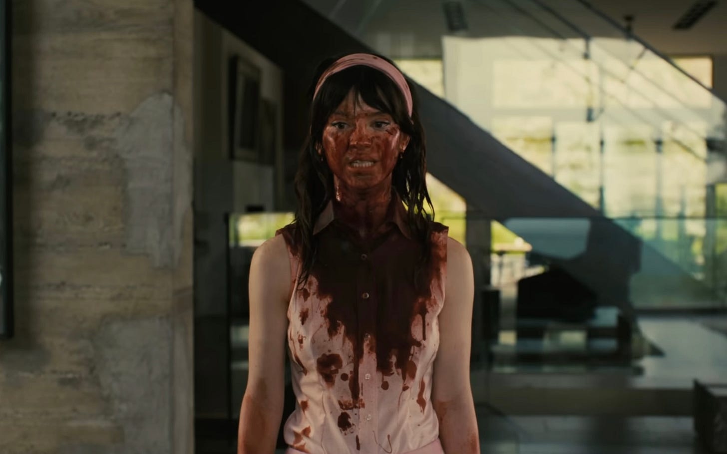 At this point the audience still doesn’t know that Iris is a robot. This first shot we see of Iris after the encounter shows her completely covered in blood walking into the house looking for Josh, her “boyfriend”, and the others. All people involved in this scene are panicking until Josh says, in the same cadence as before, “Iris, go to sleep” and Iris’s eyes turn white as she shuts down. Iris then wakes up restrained, Josh now has to say goodbye to his companion as they wait for the police to arrive. This is the moment he reveals to Iris that she is a robot. What a brutal awakening. He demonstrates this to her through an app on his phone that controls her. This is when we learn that she is sentient—she is confused and heartbroken to learn everything is a lie. Her memories, her meet-cute with Josh— everything. Even through these feelings she, unfortunately, is still programmed to love, obey, and be obsessed with Josh because she is a companion robot— a “sex bot”, which she has been referred to as in the movie. Then we, the Audience and Iris, learn that Josh essentially “jailbroke” Iris to be able to kill Sergey. But why?