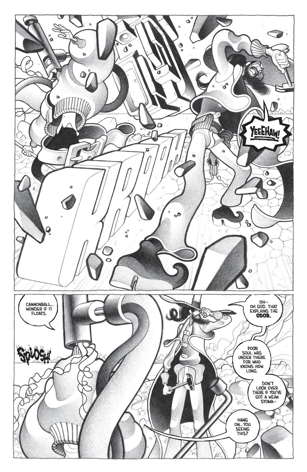 The space-faring rogue known as Faceless and his found family of adventurers are about to encounter a new challenge– stronger, stranger, and more perplexing than any they’ve faced before. Roving the backwaters of the class-segregated alien world called the Hand Planet, Faceless is plunged into his most harrowing ordeal yet– bonded to a living suit of extraterrestrial armor that refuses to let him go. As the armor’s inscrutable will tightens its grip, Faceless finds himself physically under siege. Enter a bizarre, labyrinthine world of impossible logic and nightmarish wonder as Faceless and his unlikely family must embark on a harrowing quest to free him– if freedom is even possible.