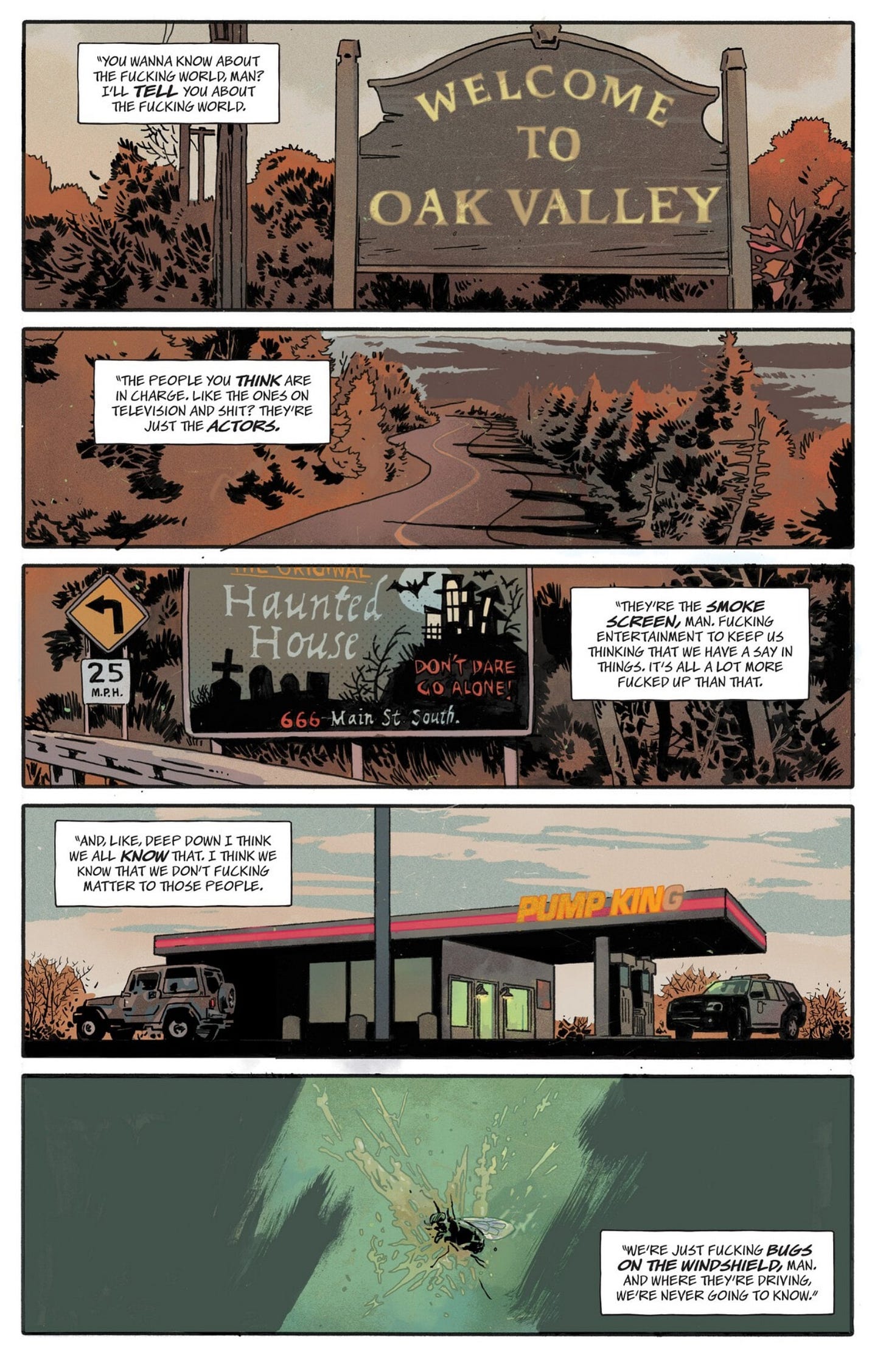 First of all, what is Exquisite Corpses about? Every five years on Halloween the thirteen richest families in America play a game. Each family chooses a killer to compete in a battle royale and the family that wins will rule the United States for the next half decade. Some killers are unpredictable serial killers while some are calculated professional assassins, but each killer has a unique design and theme—which has made fans root for their favorite killer before the comic even dropped. The co-creator and lead artist of the series Michael Walsh did a phenomenal job visually crafting each of their identities and making every killer iconic and memorable—and cool, this comic has a majorly cool factor to it. Each killer is allowed one type of weapon which is drawn randomly by picking a card—yes see, the card game next year is all making sense! The arena that these killers will be playing in is a small town called Oak Valley, whose citizens will also have to fight to survive the night—similar to the Purge, though with no prep or warning for the oncoming slaughter.