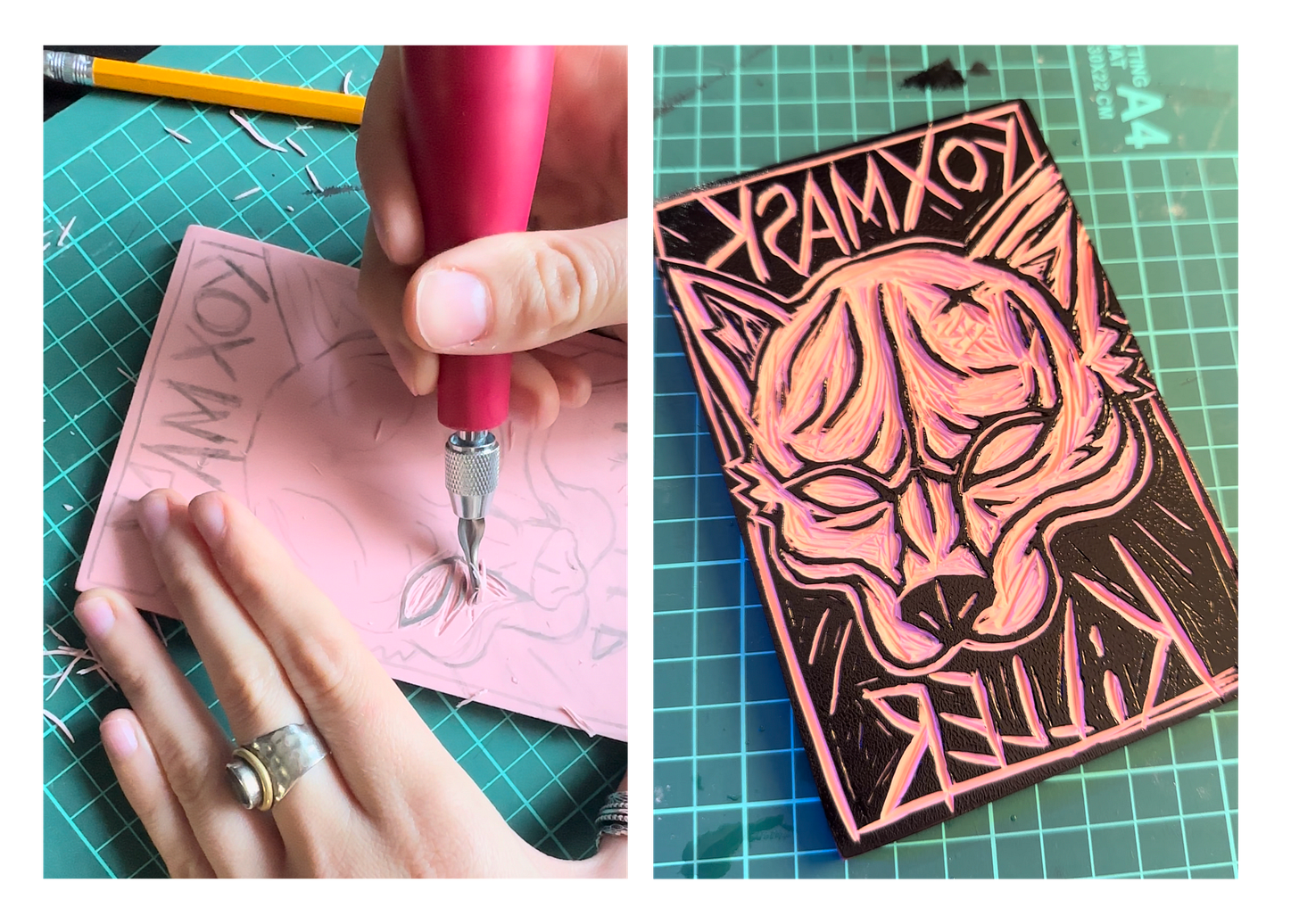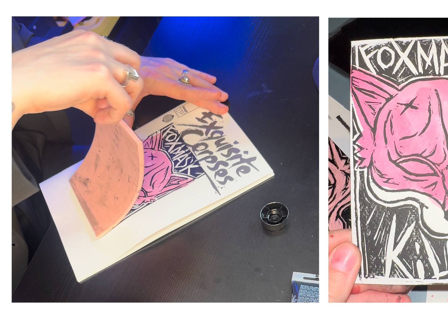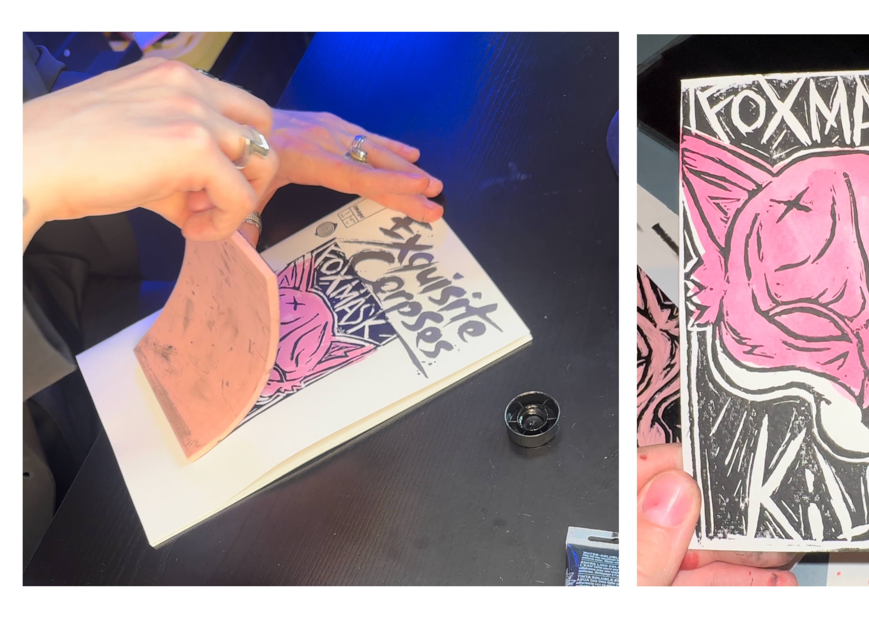 Tiny Onion collaborated with Revenge Of (the premier comic shop in LA that is part comic shop, part pinball arcade, and part comic events space) for the Exquisite Corpses release party this past Friday. And I had the honor to attend and interview the creative team. And! I gifted the Corpse Crew and Tiny Onion team some linocut prints of, arguably the mascot of the series, The Fox Mask Killer.