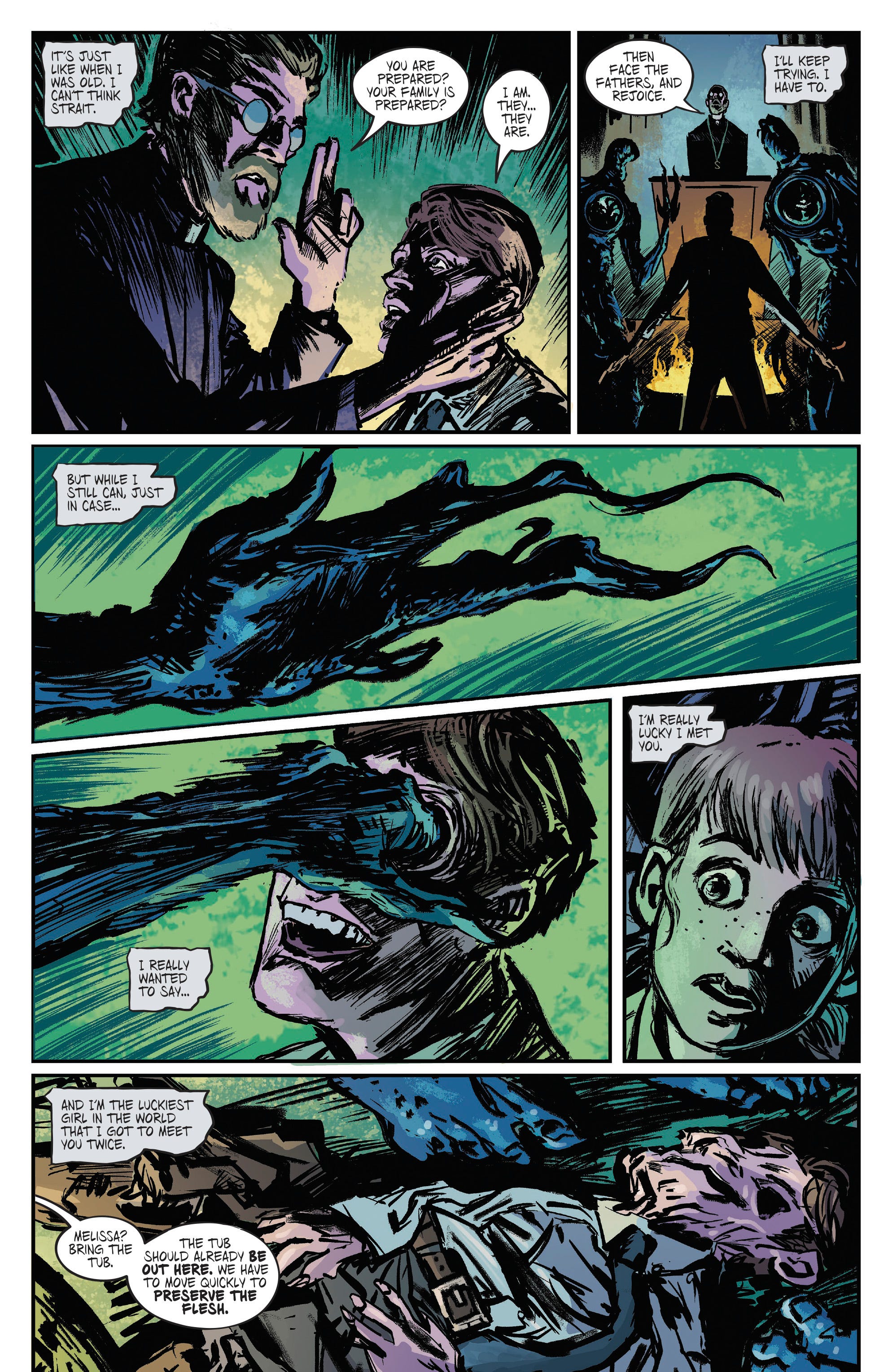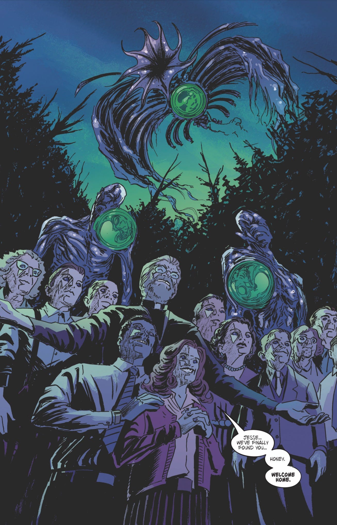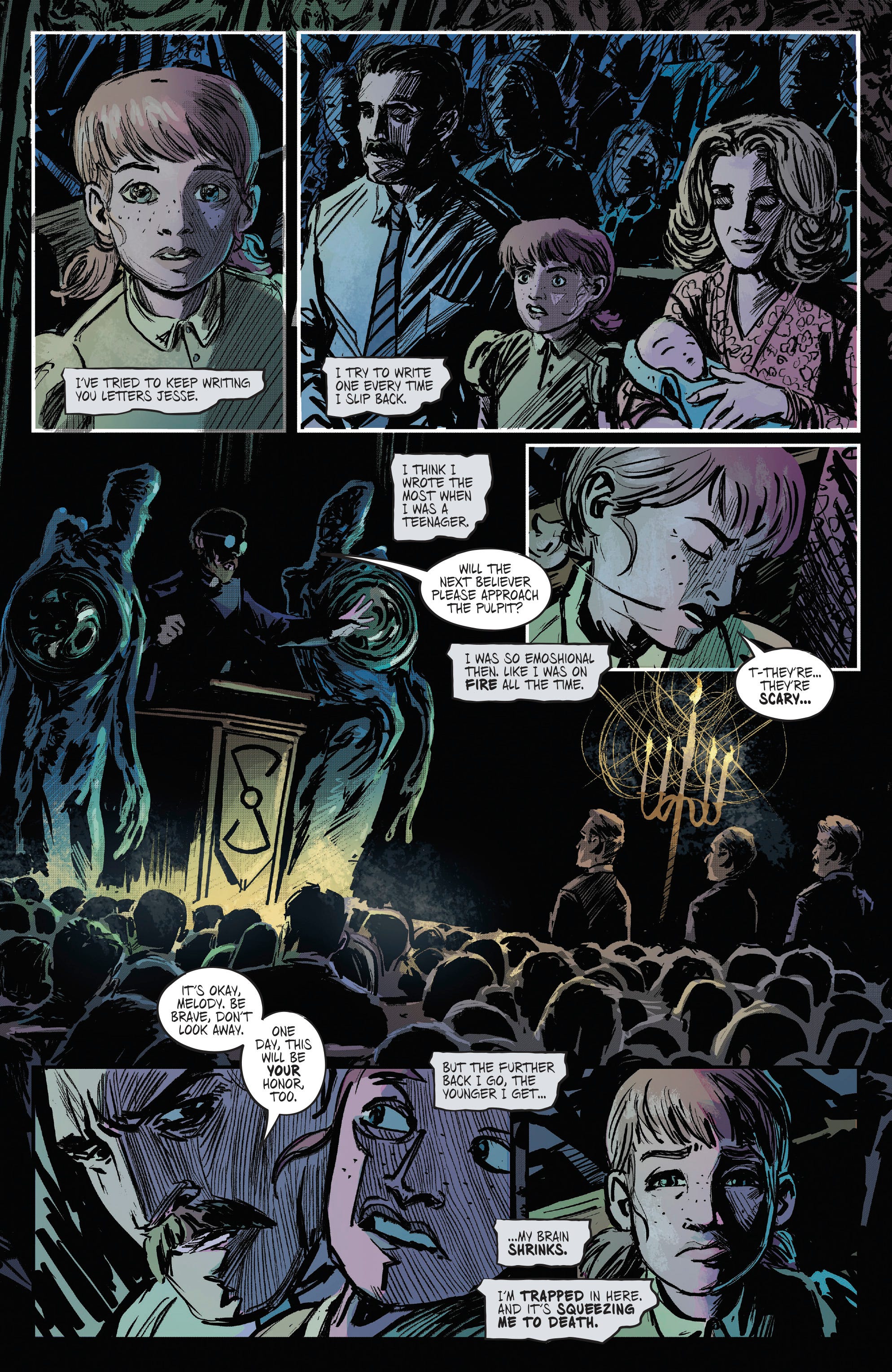 As Jesse Harmond traverses the unnerving near-abandoned town, she finds her way to Melody Nelson after all these years–but Melody doesn’t remember her. At least, not at first. We soon find out that Melody has potentially died and is tumbling through time. Reality is unraveling around her while she tries to remember who she is and figure out what’s real. And the townspeople? There is something not right about them, they aren’t quite human–at least not anymore. And it all revolves around this mysterious church. And it looks like it’s pretty much confirmed in this first look that there might be an Invasion of the Body Snatchers element here. So without further ado here is the official first look of Blink and You’ll Miss It issue #4: